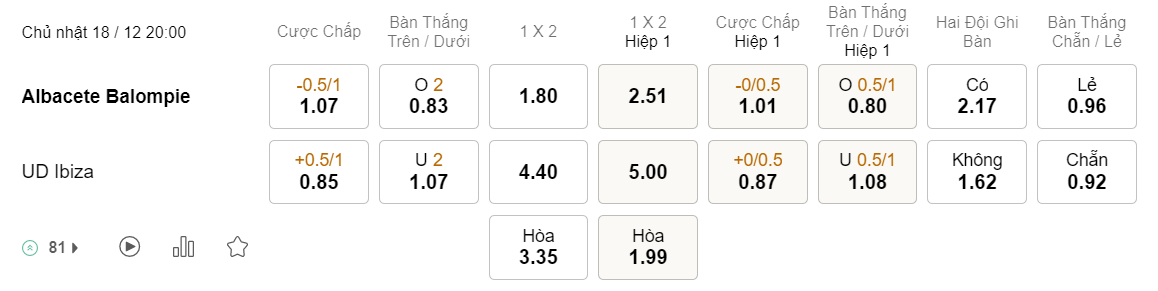 Tỉ lệ kèo Albacete vs Ibiza