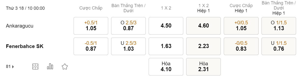 Soi kèo hiệp 1 Ankaragucu vs Fenerbahce: 1.05*0/0.5*0.83