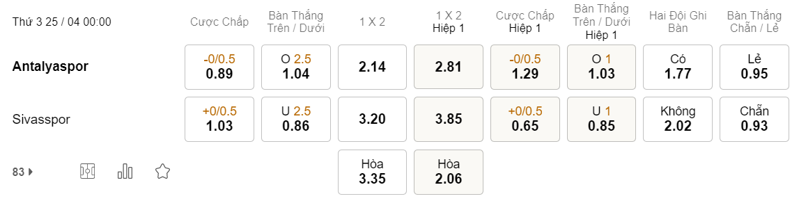 Soi kèo châu Á Antalyaspor vs Sivasspor: 0.89*0/0.5*1.03