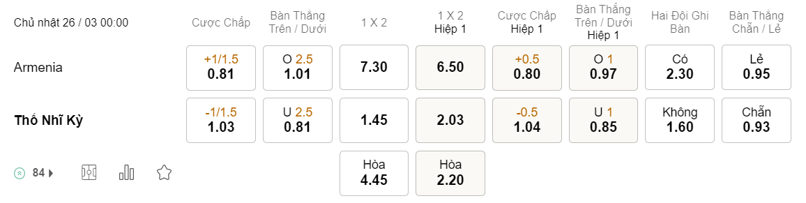 Tỉ lệ kèo Armenia vs Thổ Nhĩ Kỳ