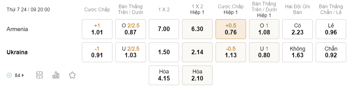 Soi kèo hiệp 1 Armenia vs Ukraine: 0.76*0.5*1.13