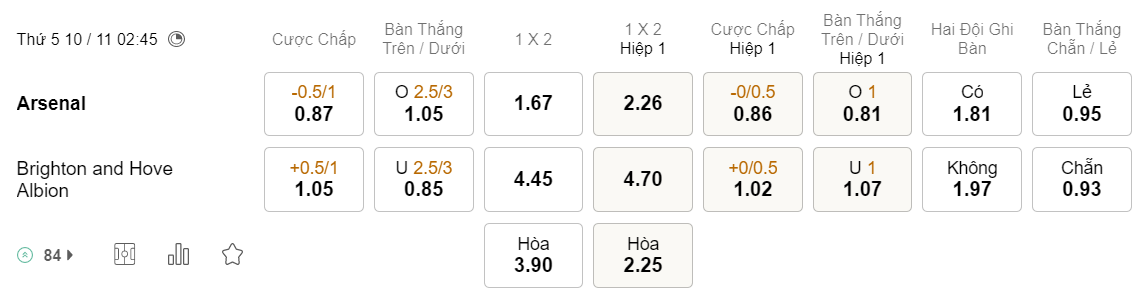 Soi kèo châu Á Arsenal vs Brighton: 0.87*0.5/1*1.05