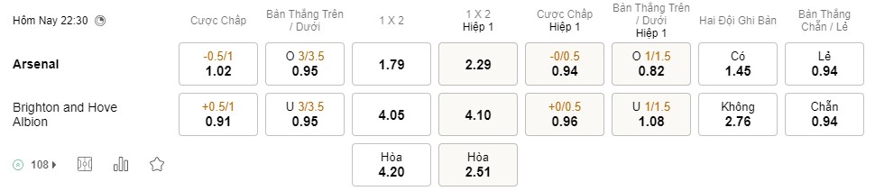 Với nhịp độ trận đấu cao và áp lực lớn luôn được Arsenal cũng như Brighton tạo ra, không mấy bất ngờ khi biết rằng bàn thắng đã xuất hiện ngay trong hiệp 1 ở cả 3 lần gần nhất 2 đội trạm chán. Do đó, khả năng cao 45 phút đầu tiên của trận đấu này sẽ khép lại với lợi thế dẫn bàn cho Đội chủ nhà.