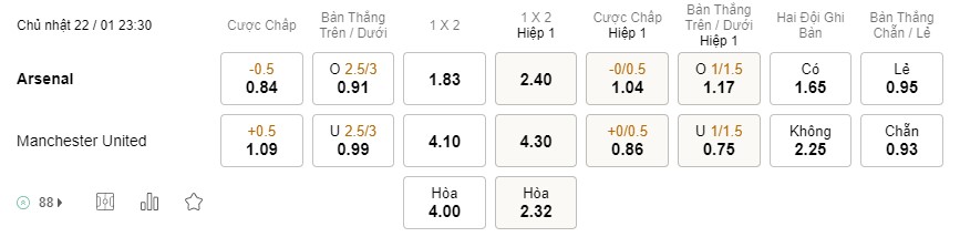 Tỉ lệ kèo Arsenal vs MU