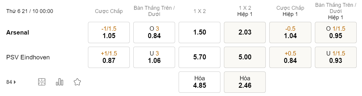 Soi kèo hiệp 1 Arsenal vs PSV: 1.04*0.5*0.84