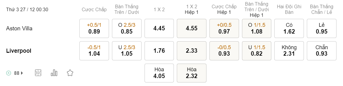 Tỉ lệ kèo Aston Villa vs Liverpool