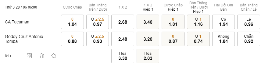 Soi kèo hiệp 1 Atletico Tucuman vs Godoy Cruz: 1.01*0*0.87