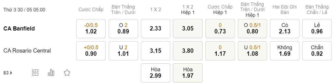 Tỉ lệ kèo Banfield vs Rosario Central