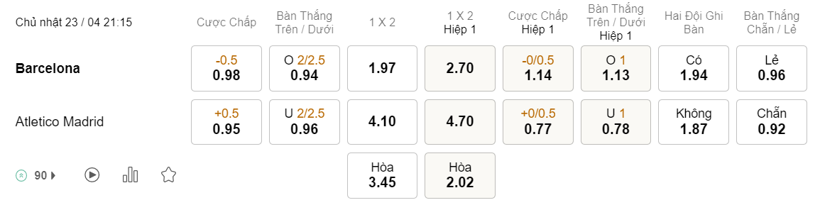 Soi kèo hiệp 1 Barcelona vs Atletico Madrid: 1.14*0/0.5*0.77