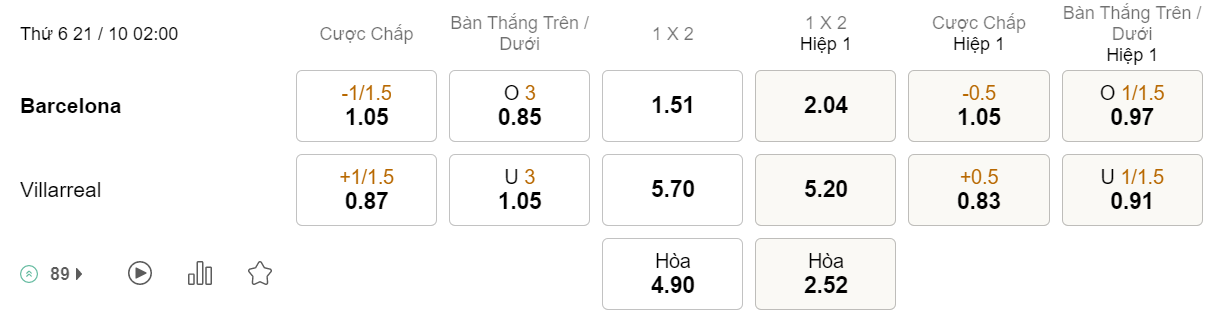 Soi kèo hiệp 1 Barcelona vs Villarreal: 1.05*0.5*0.83