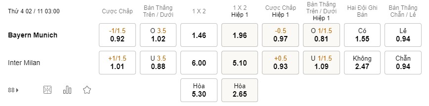 Tỉ lệ kèo Bayern vs Inter