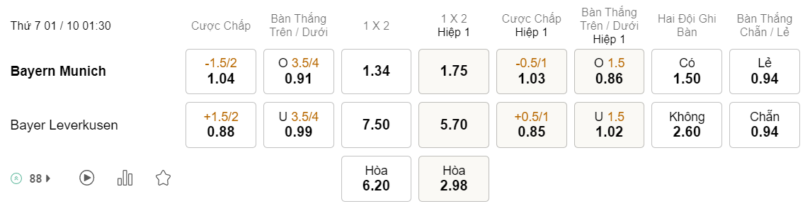 Soi kèo châu Á Bayern vs Leverkusen: 1.04*1.5/2*0.88