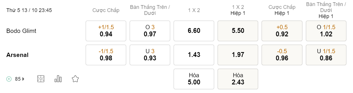 Soi kèo châu Á Bodo Glimt vs Arsenal: 0.94*1/1.5*0.98