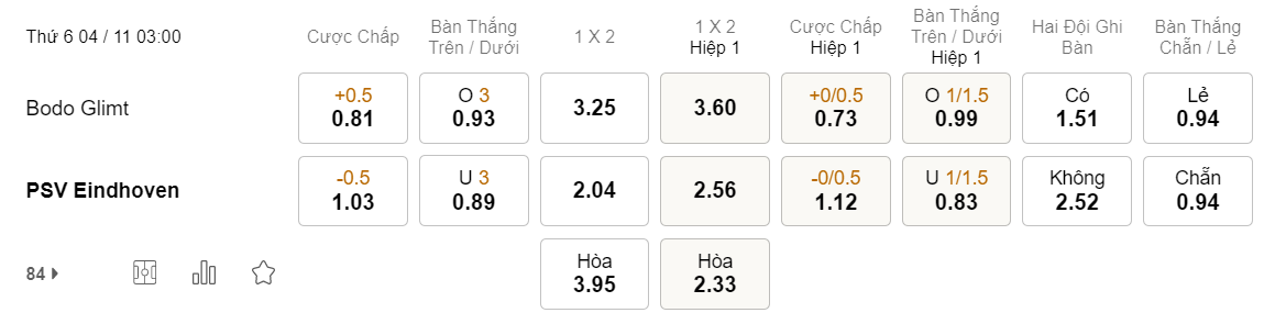Soi kèo hiệp 1 Bodo Glimt vs PSV: 0.73*0/0.5*1.12