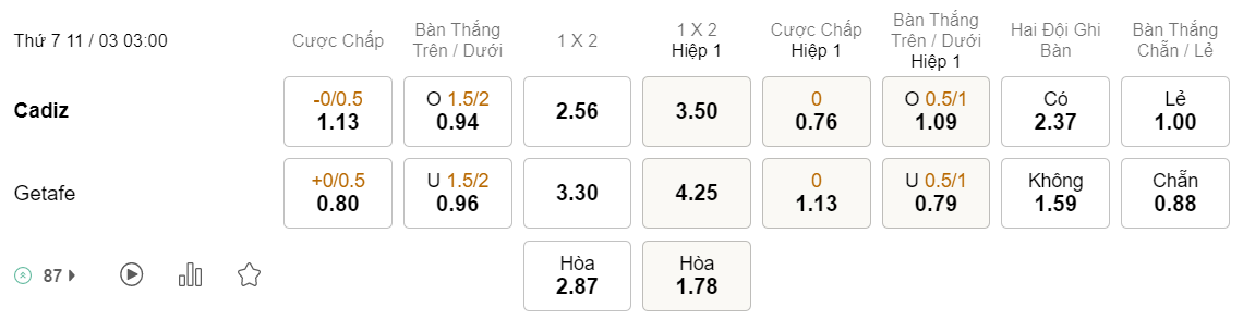 Soi kèo hiệp 1 Cadiz vs Getafe: 0.76*0*1.13