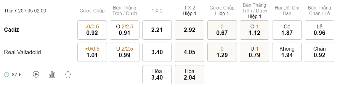 Soi kèo châu Á Cadiz vs Valladolid: 0.92*0/0.5*1.01