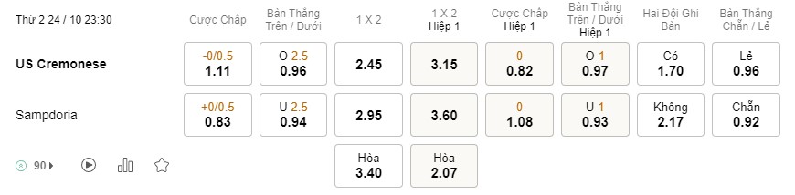 Soi kèo châu Á Cremonese vs Sampdoria: 1.11*0/0.5*0.83