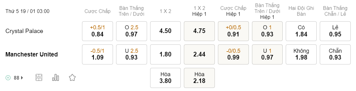 Soi kèo châu Á Crystal Palace vs MU: 0.88*0.5/1*1.05