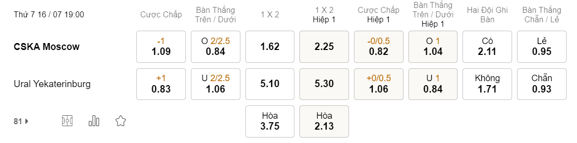 Trong khi đó nhìn sang đội khách, Ural có thực lực yếu hơn và phong độ cũng thiếu ổn định với 1 thắng, 1 hòa và 1 thua trong 3 trận gần nhất. Vì vậy các chuyên gia nhận định, lựa chọn CSKA Moscow trong trận đấu này sẽ là chính xác hơn.