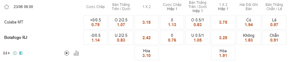 Soi kèo Châu Á Cuiaba vs Botafogo: 0.79*0/0.5*1.14