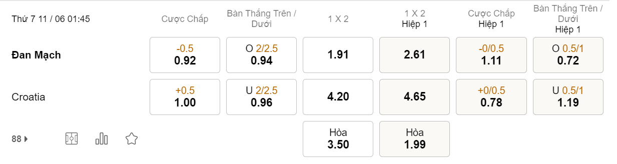 Soi kèo châu Á Đan Mạch vs Croatia: 0.92*0.5*1.00