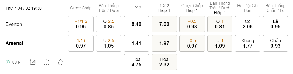 Tỉ lệ kèo Everton vs Arsenal