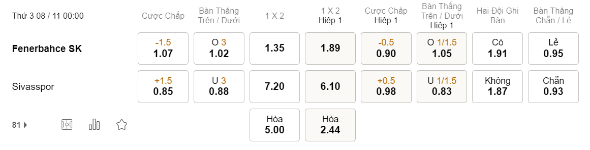 Tỉ lệ kèo Fenerbahce vs Sivasspor