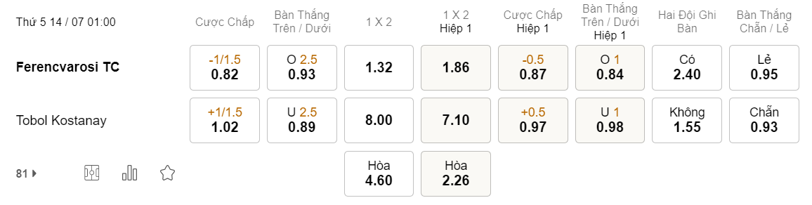 Tỉ lệ kèo Ferencvaros vs Tobol