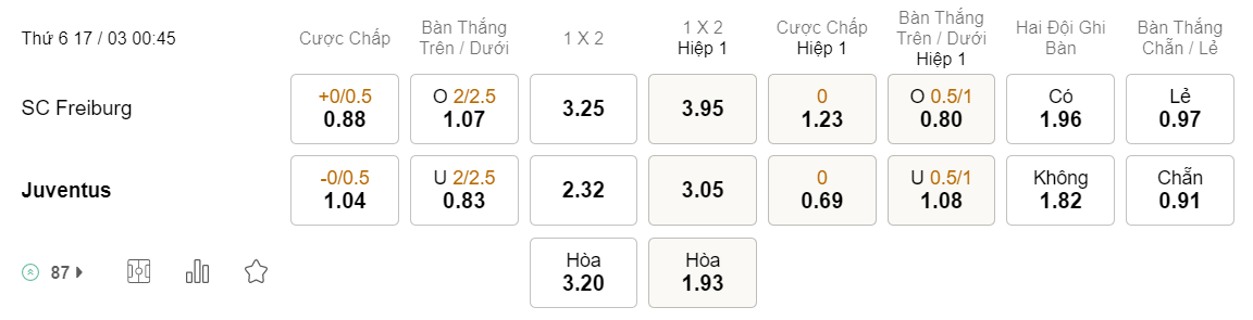 Tỉ lệ kèo Freiburg vs Juventus