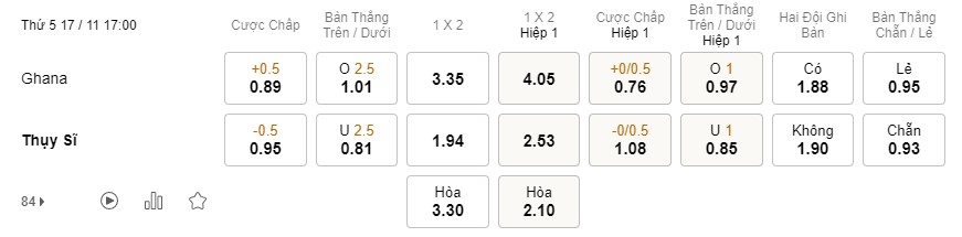 Tỉ lệ kèo Ghana vs Thụy Sĩ