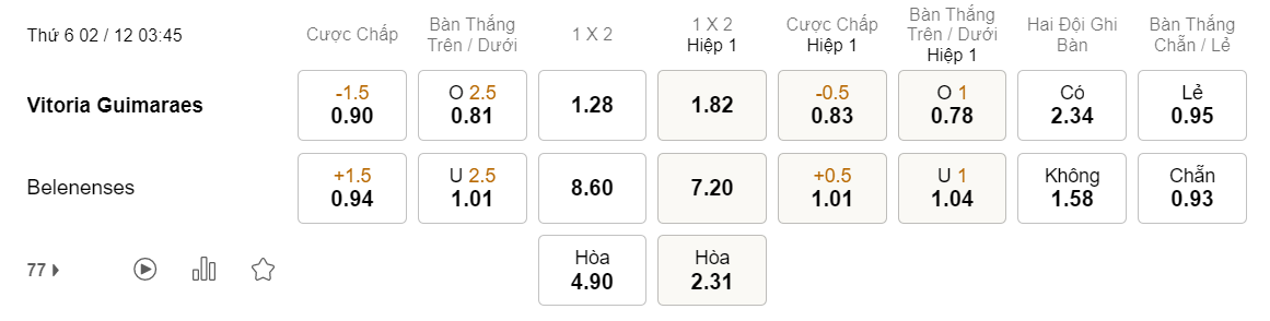 Tỉ lệ kèo Guimaraes vs Belenenses