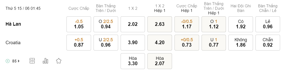Soi kèo hiệp 1 Hà Lan vs Croatia: 1.17*0/0.5*0.73