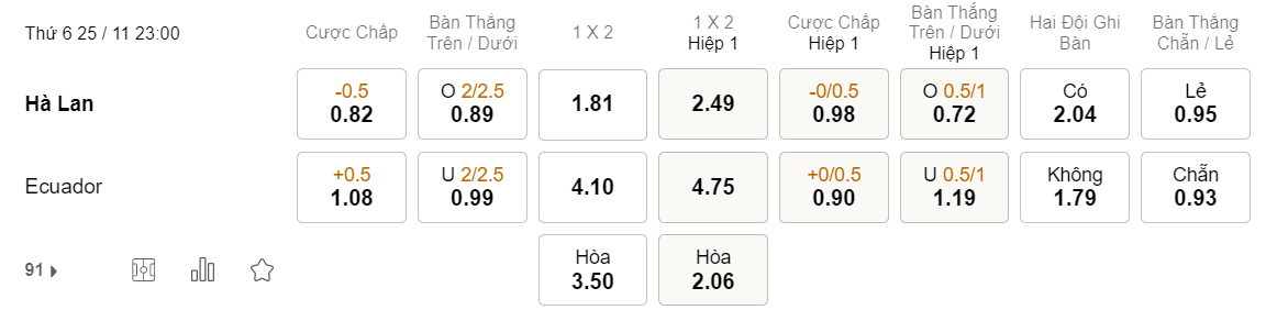 Tỉ lệ kèo Hà Lan vs Ecuador