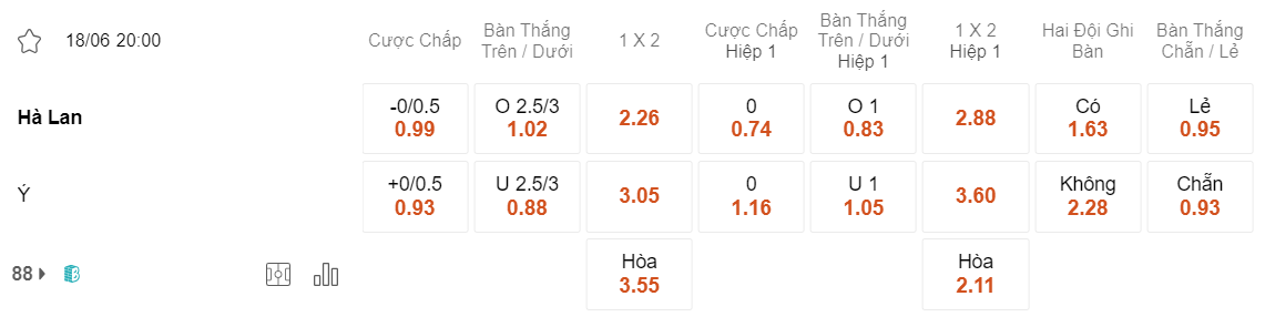 Tỉ lệ kèo Hà Lan vs Ý