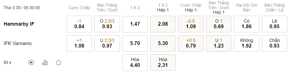 Tỉ lệ kèo Hammarby vs Varnamo