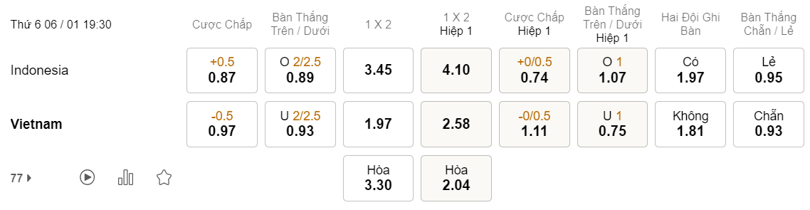 Soi kèo hiệp 1 Indonesia vs Việt Nam: 0.74*0/0.5*1.11