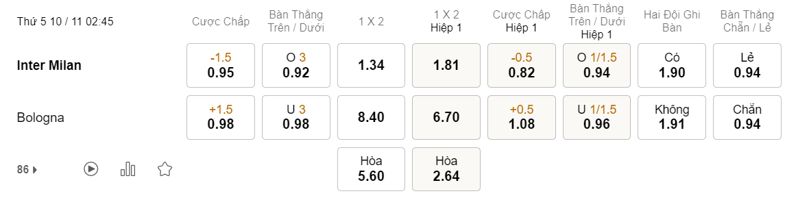 Tỉ lệ kèo Inter vs Bologna