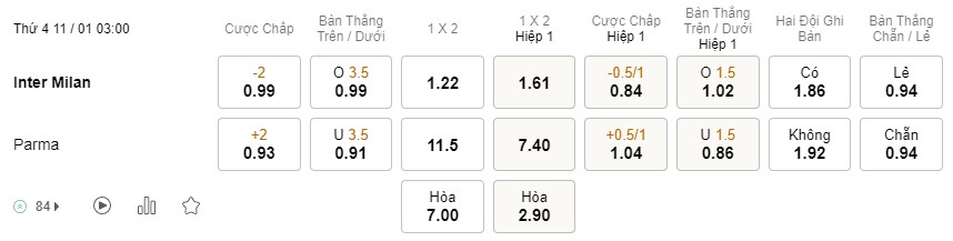 Soi kèo hiệp 1 Inter vs Parma: 0.84*0.5/1*1.04