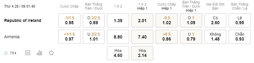 Soi kèo tài xỉu Ireland vs Armenia: 0.89*2/2.5*1.01