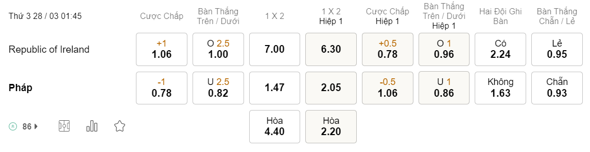 Soi kèo hiệp 1 Ireland vs Pháp: 0.78*0.5*1.06