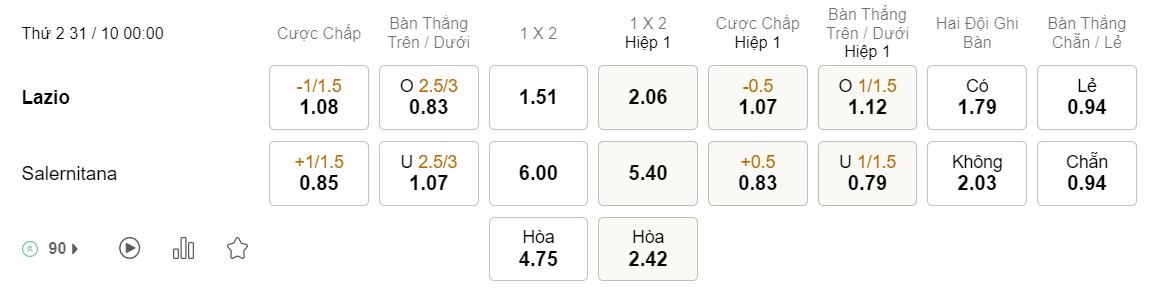 Soi kèo hiệp 1 Lazio vs Salernitana: 1.07*0.5*0.83