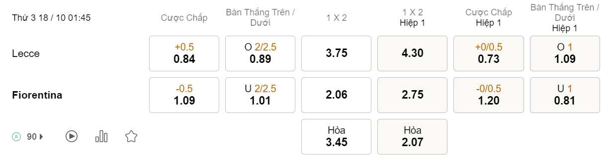 Tỉ lệ kèo Lecce vs Fiorentina