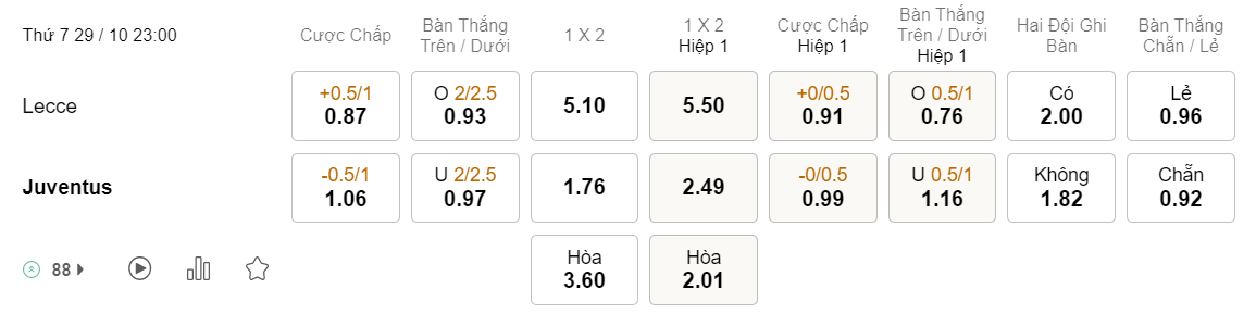 Soi kèo châu Á Lecce vs Juventus: 0.87*0.5/1*1.06
