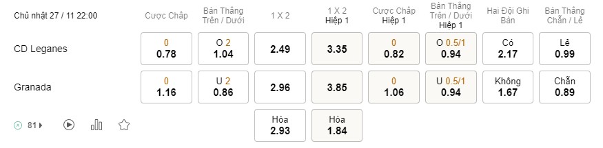 Soi kèo hiệp 1 Leganes vs Granada: 0.82*0*1.06