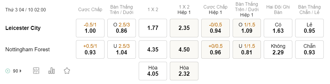 Tỉ lệ kèo Leicester vs Nottingham
