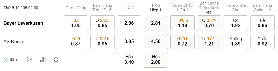 Tỉ lệ kèo Leverkusen vs Roma