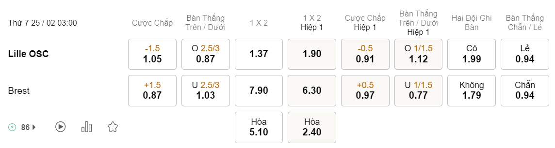 Soi kèo châu Á Lille vs Brest: 1.05*1.5*0.87