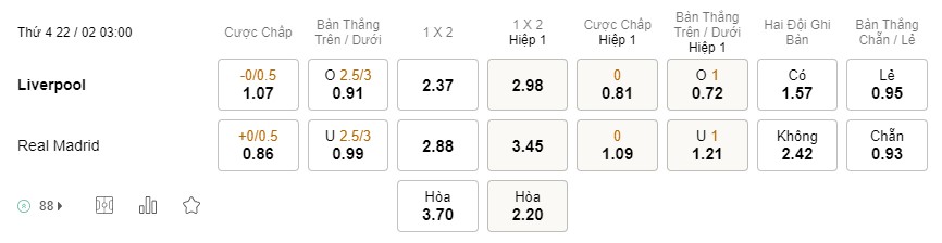 Tỉ lệ kèo Liverpool vs Real Madrid