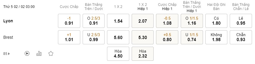 Lyon với phong độ hiện tại đang nhỉnh hơn đối thủ, họ sẽ tự tin chơi áp đảo ngay từ những phút đầu tiên. Hơn nữa, cả 5 trận gần nhất Lyon đối đầu Brest đều đã chứng kiến bàn thắng xuất hiện ngay trong hiệp 1. Vì vậy khả năng cao, Đội chủ nhà được đánh giá cao hơn sẽ sớm vươn lên ở 45 phút thi đấu đầu tiên.