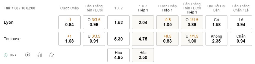Soi kèo Châu Á Lyon vs Toulouse: 0.84*1*1.08